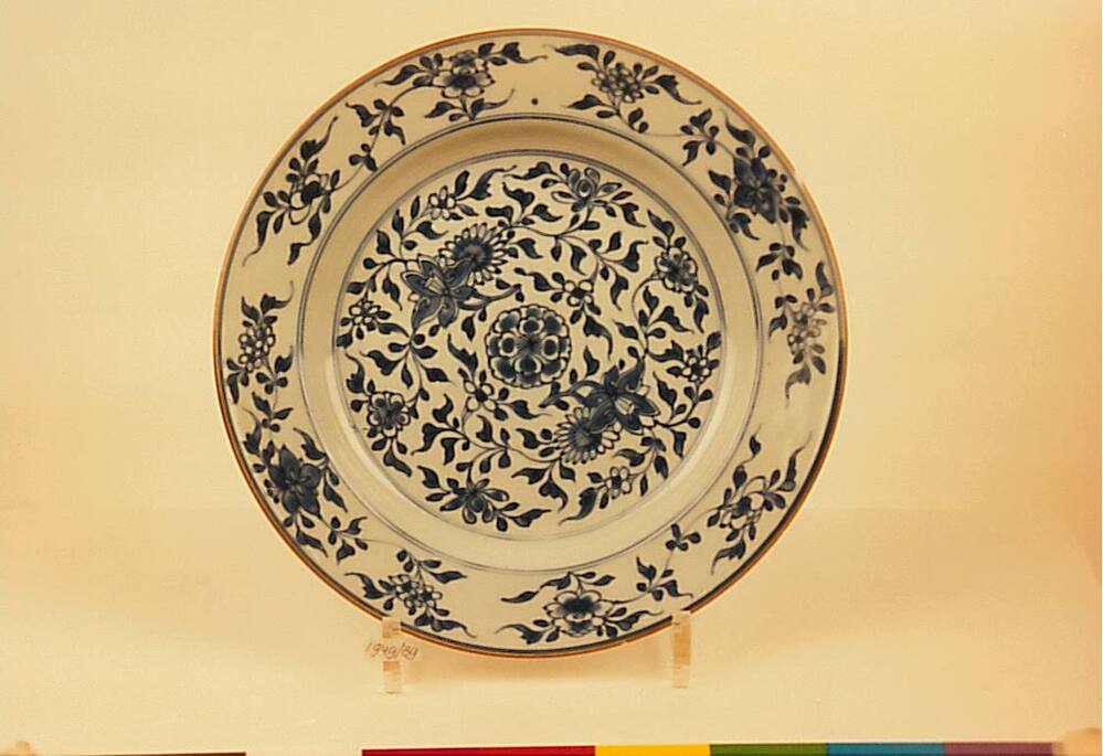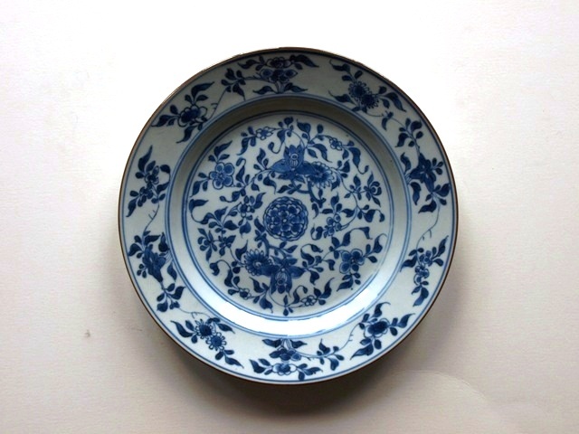Vier borden van blauw Chinees porselein met bloemmotief