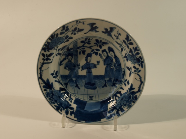 Twaalf schoteltjes van blauw Chinees porselein met vier lange lijzen