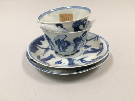 2 kopjes en 2 schoteltjes van merendeels blauw, Chinees porselein