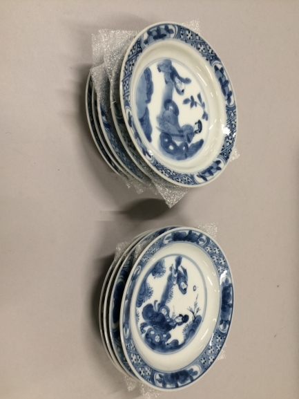 Negen schoteltjes van blauw Chinees porselein.