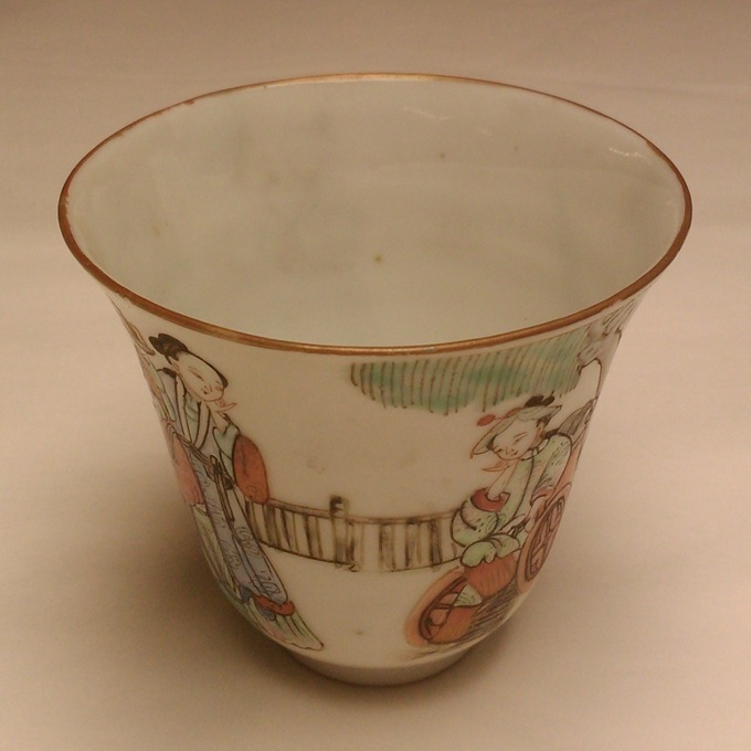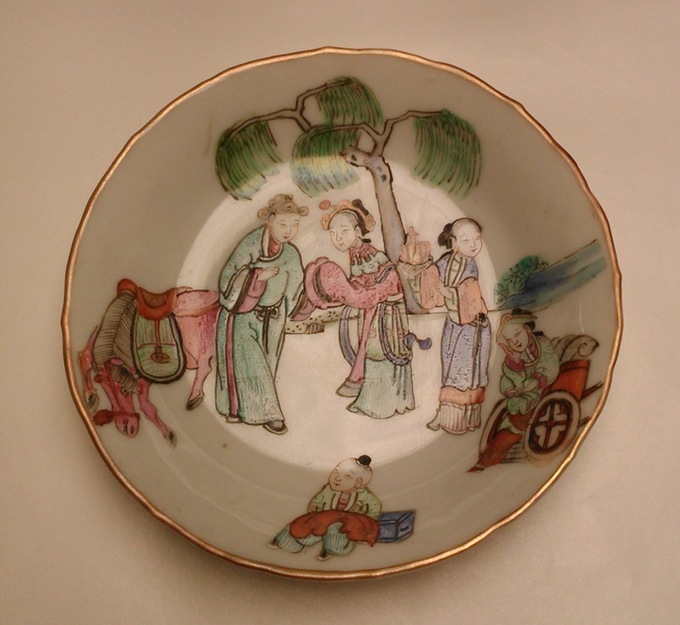 Zes koppen en twaalf schotels van gekleurd Chinees porselein met als voorstelling een treurwilg, waaronder personen