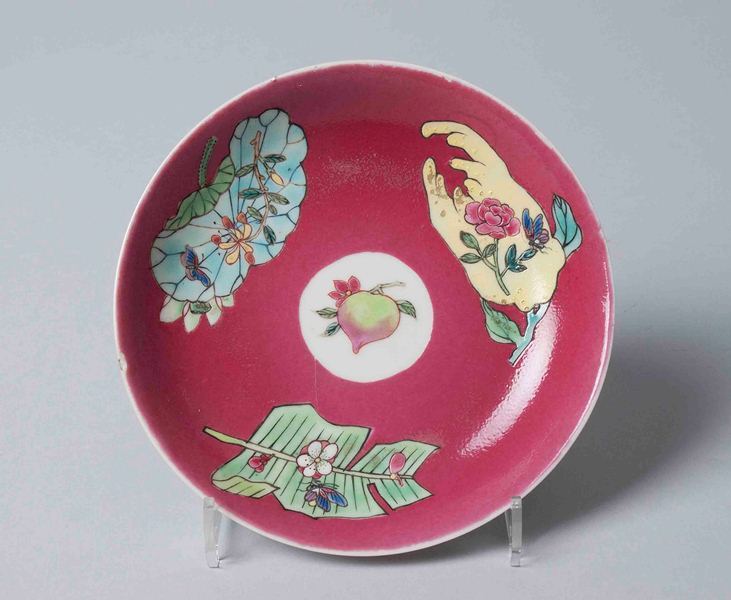 Twee schoteltjes met uitgespaarde perken waarin bloemtakjes