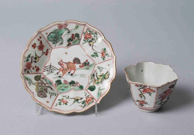 Zes kopjes en zes schoteltjes van Chinees porselein waarop vogeltje op een tak