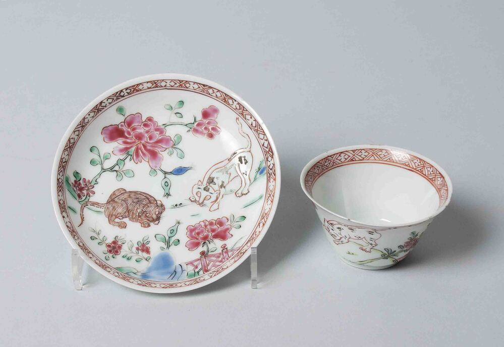 Vier kopjes en vijf schoteltjes van Chinees porselein met bloem en panterdecor