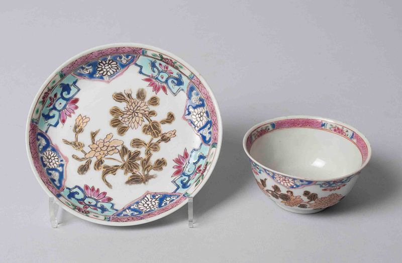Vier kopjes en vier schoteltjes van Chinees porselein waarop goud en bruine bloemen