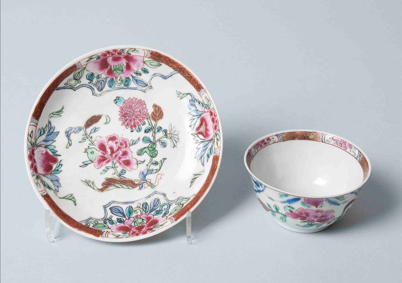Vier kopjes en twee schoteltjes van Chinees porselein waarop bloemen