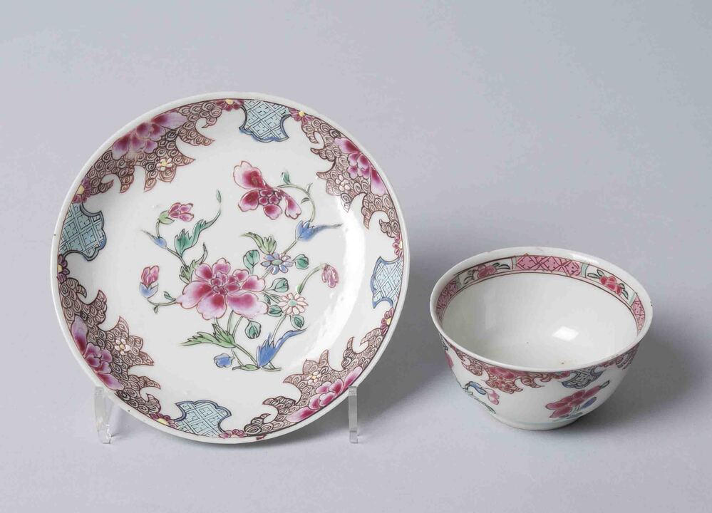 Vijf kopjes en vijf schoteltjes van Chinees porselein met bloemdecor