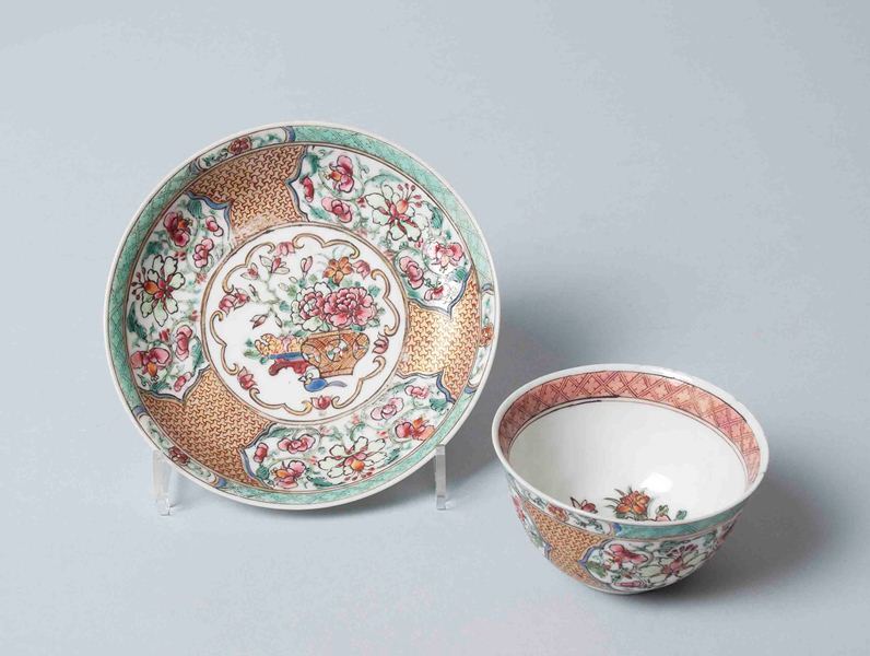 Twee kopjes en twee schoteltjes van Chinees porselein waarop perken met bloemen
