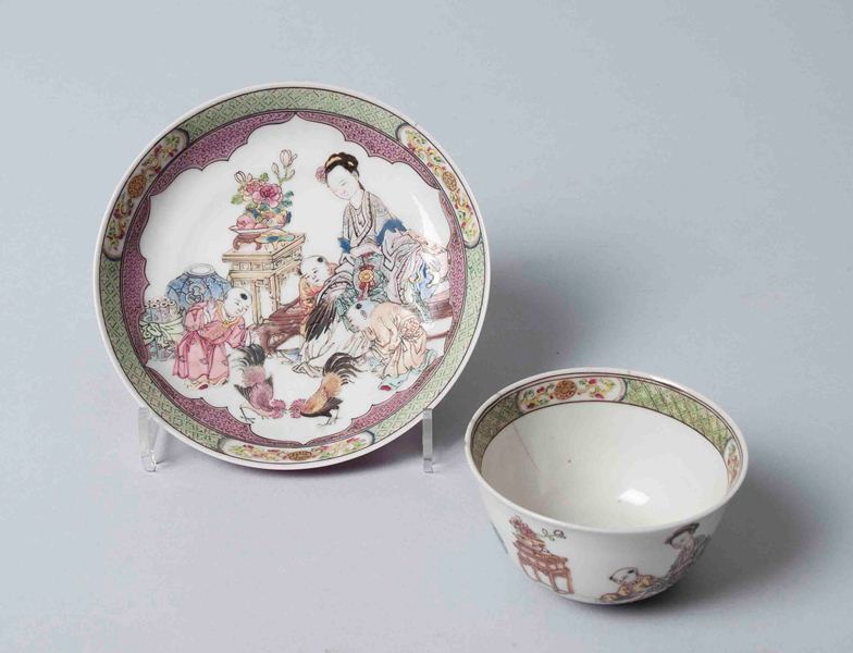 Kopje en schoteltje van Chinees porselein waarop Chinees gezelschap kijkend naar hanengevecht