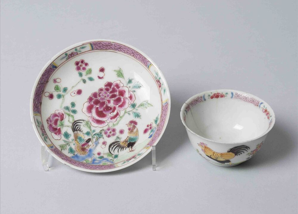 Eén kopje en vier schoteltjes van Chinees porselein waarop bloempatroon met haantjes