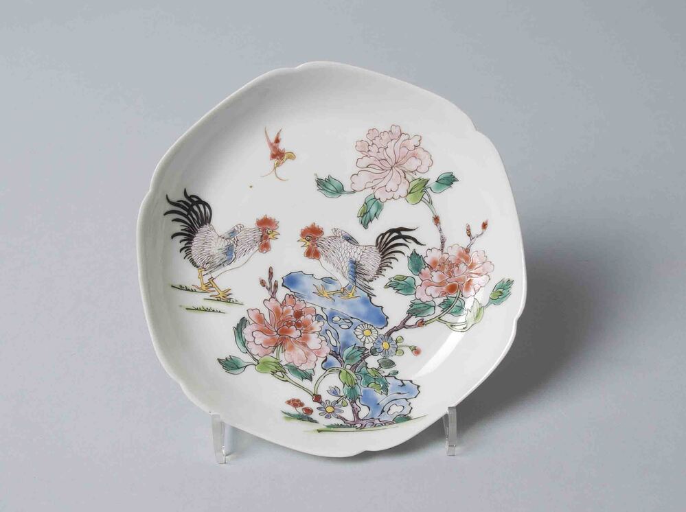 Vier zeskantige schoteltjes van Chinees porselein waarop bloem met twee hanen