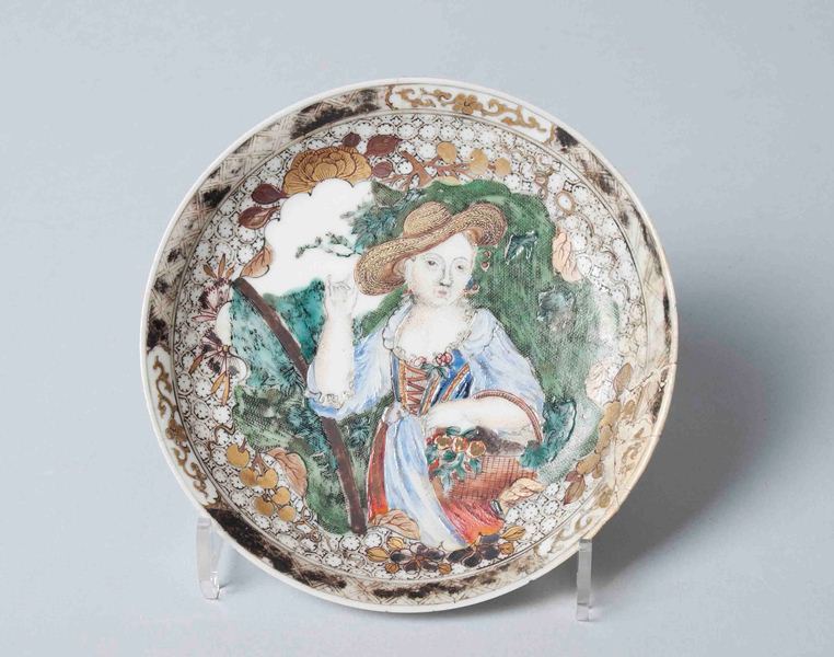 Drie schoteltjes van Chinees porselein waarop meisje met hoed