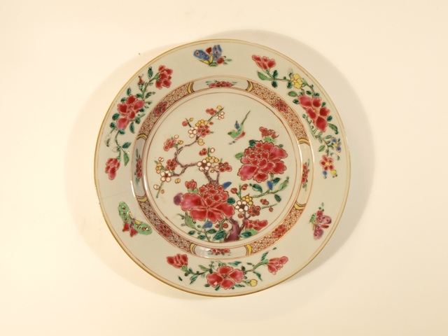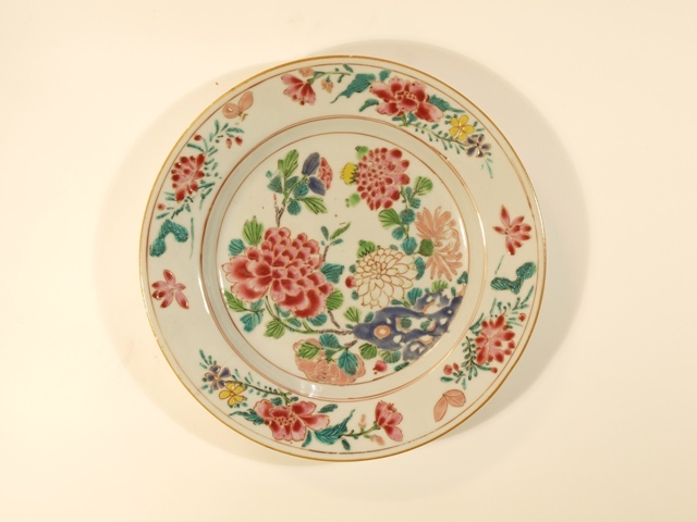 Zes porseleinen borden van gekleurd Chinees porselein famille rose