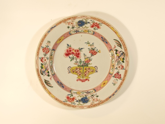 Zes porseleinen borden in famille rose met bloemenmand decor