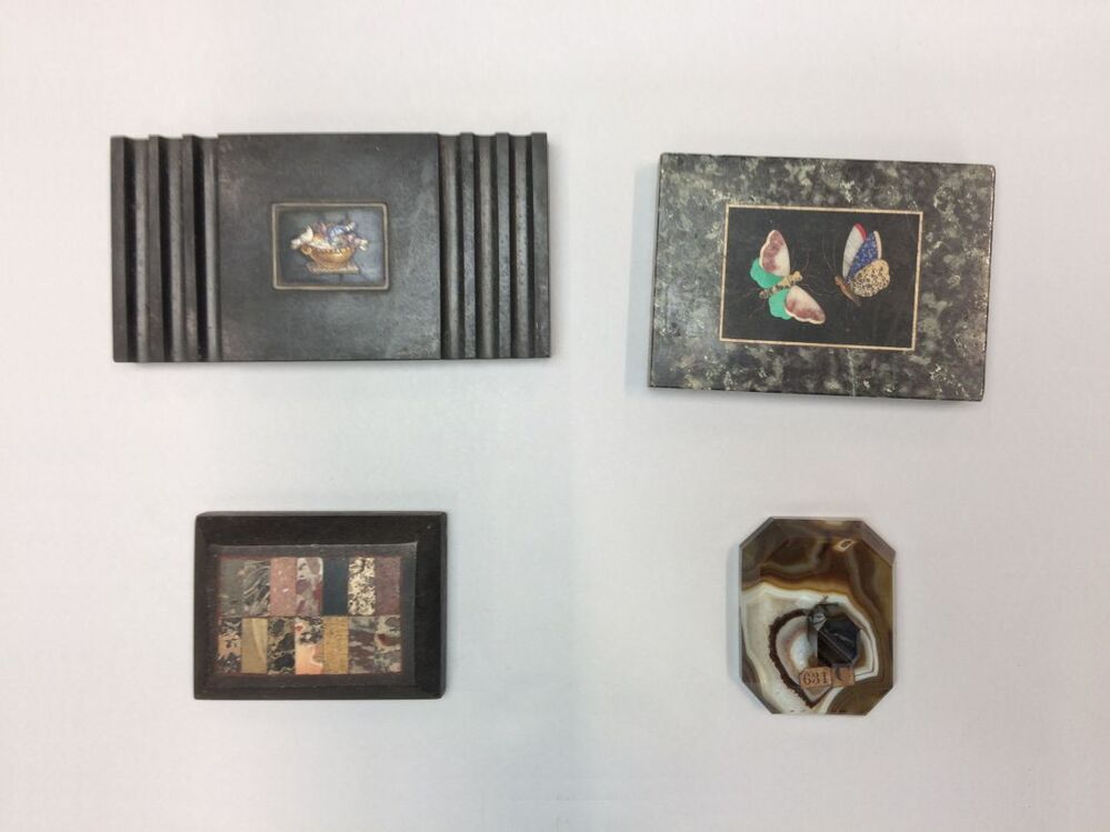 Vijf diverse stukken ingelegd Italiaans mozaiek waarvan er vier zijn aangetroffen