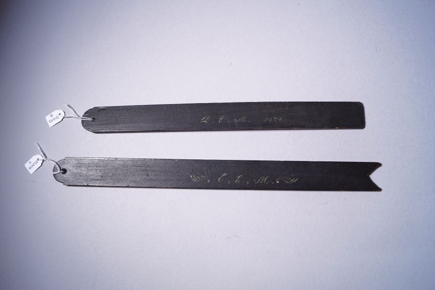 Twee zwart geverfde latten met initialen en jaartal 1876