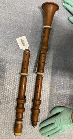 Palmhouten fluit met kleppen waarvan het mondstuk ontbreekt, vier fluitstukken en twee dubbele (reserve) onderdelen