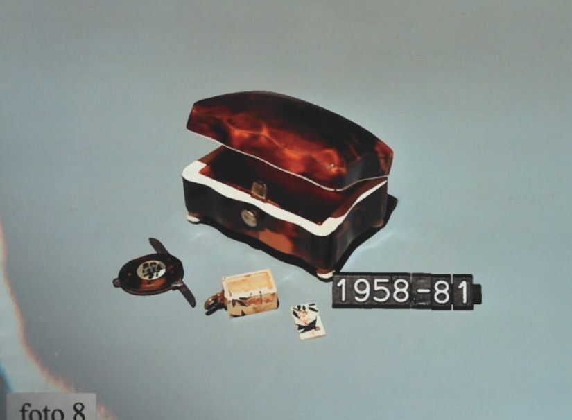 Schildpaddoosje met daarin een benen doosje en medaillonnetje van schildpad met twee tornmesjes