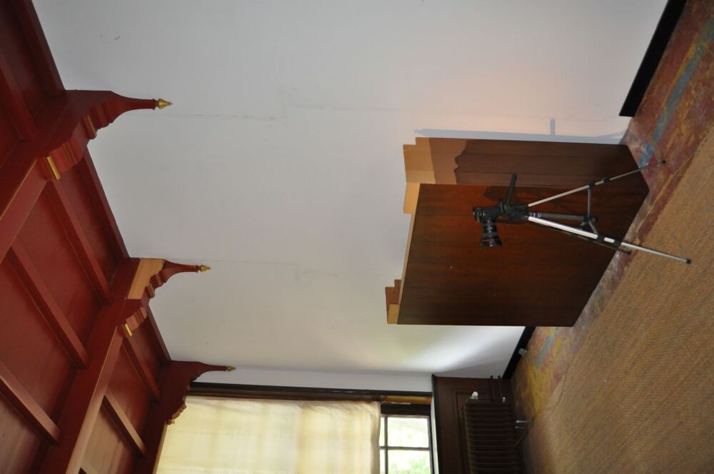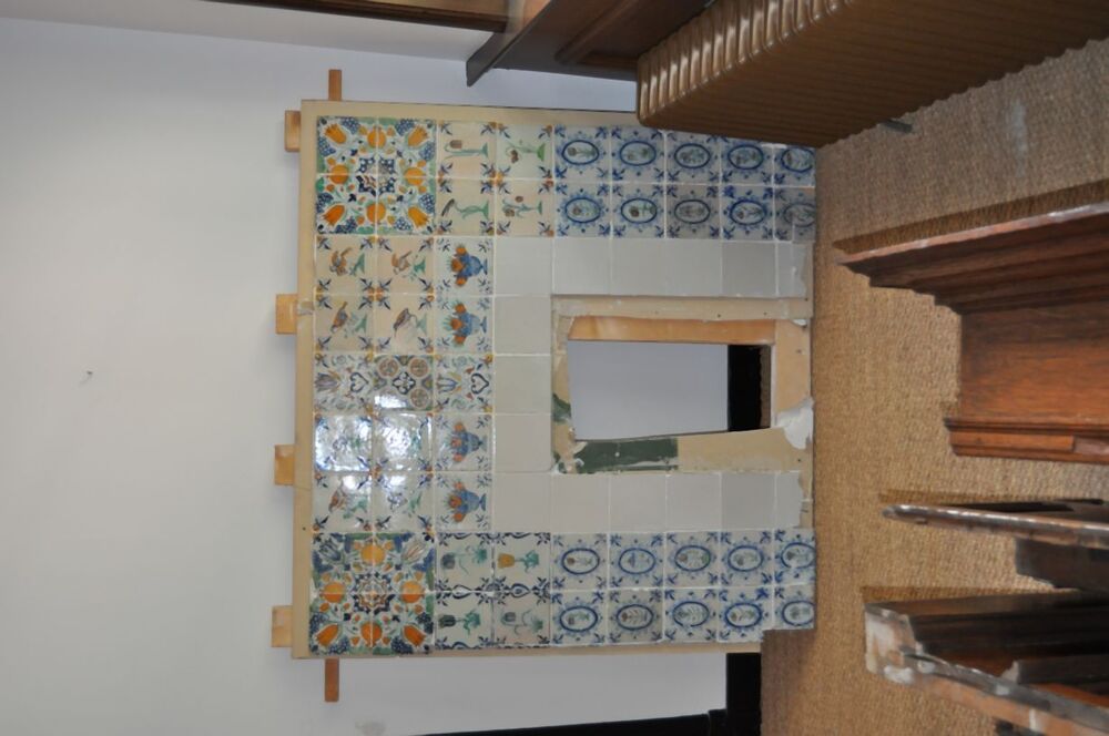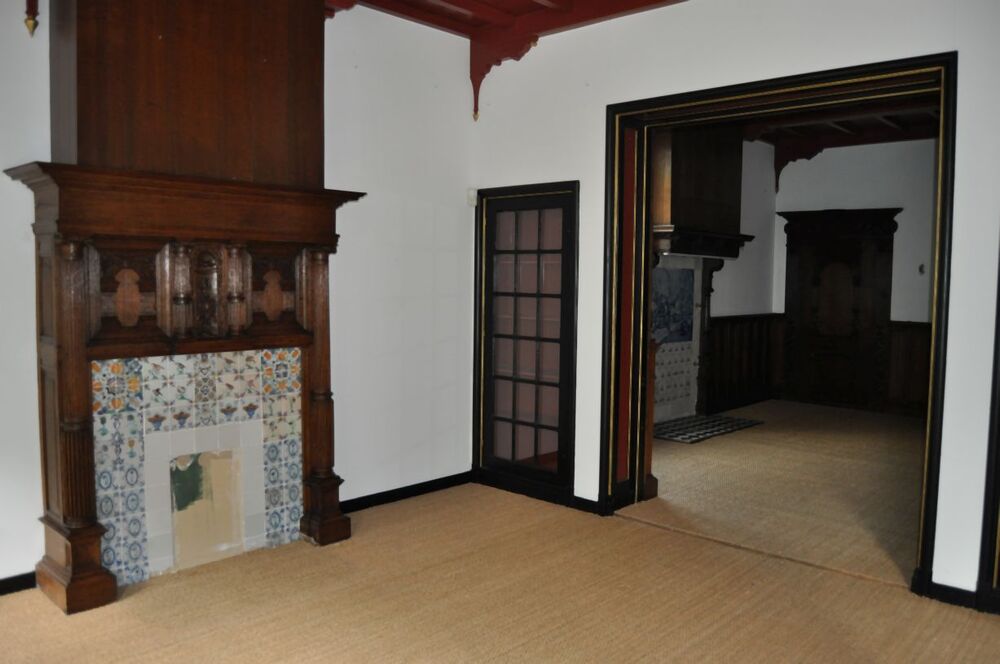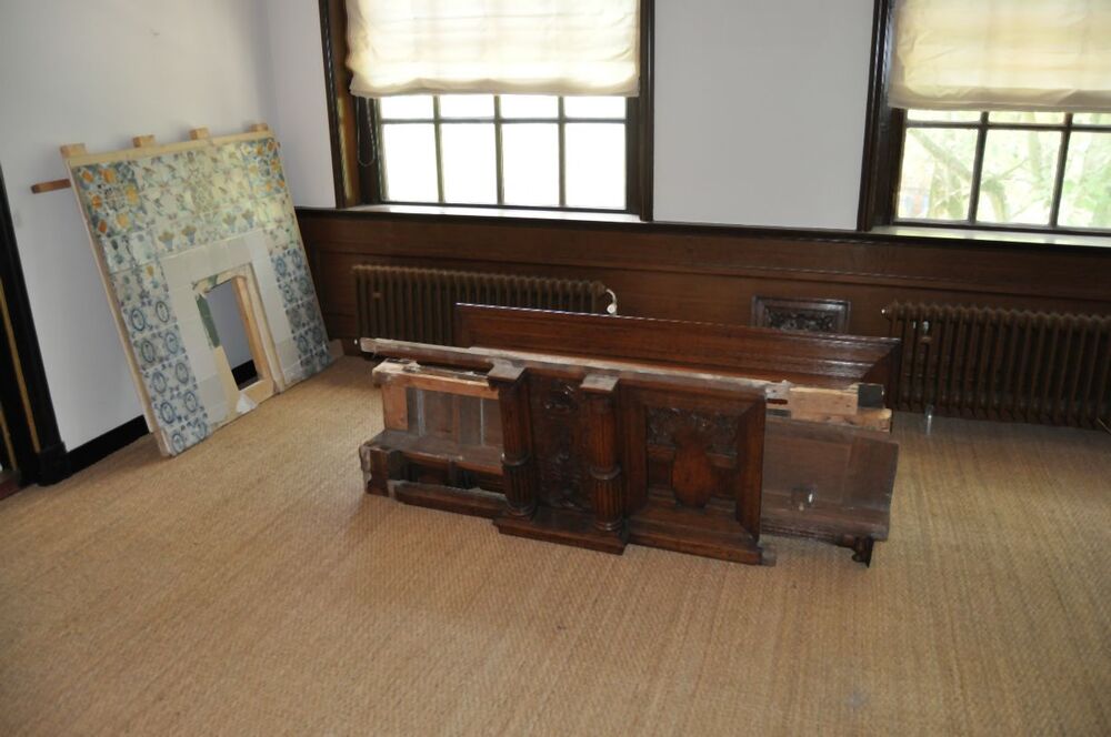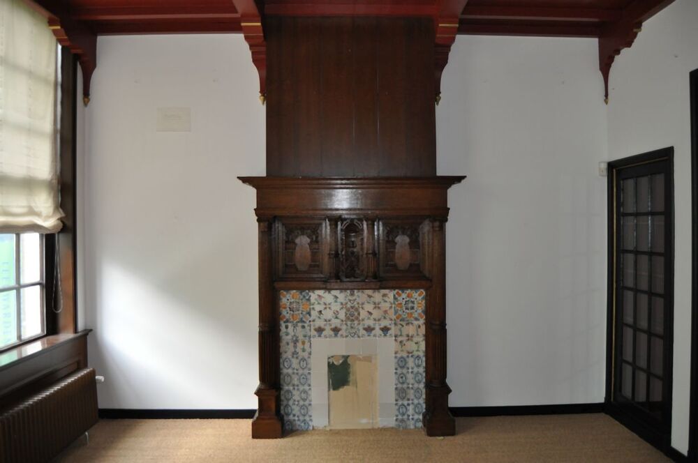Schouw of schoorsteenmantel verdeeld in drie vakken waarop een vaas met bloemen