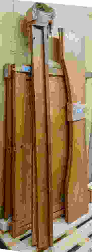 Iepenhouten ledikant met groene hemelbedgordijnen en kap.