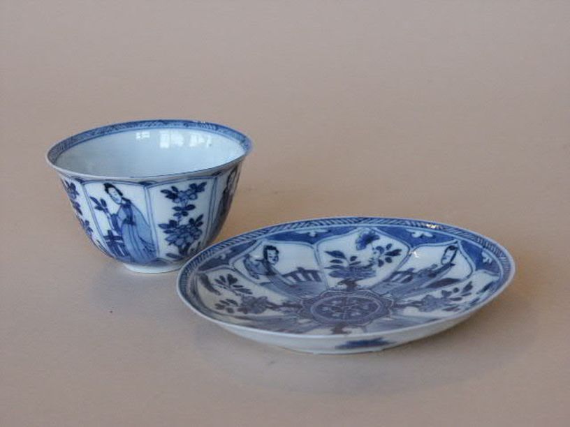 6 koppen en 11 schotels met decor van rozet en panelen waarin Chinese dame of bloeiende boom