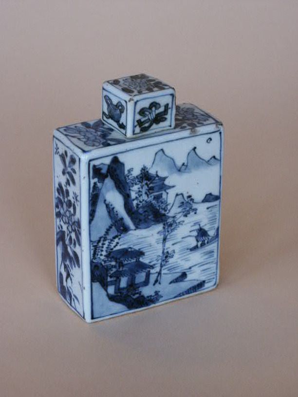 Twee theebussen met dop met rechthoekige vorm en decor van landschap en bloem