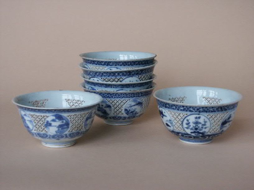 7 kommen met 6 medaillons met decor van waterlandschap of bloemtak, overgangsporselein