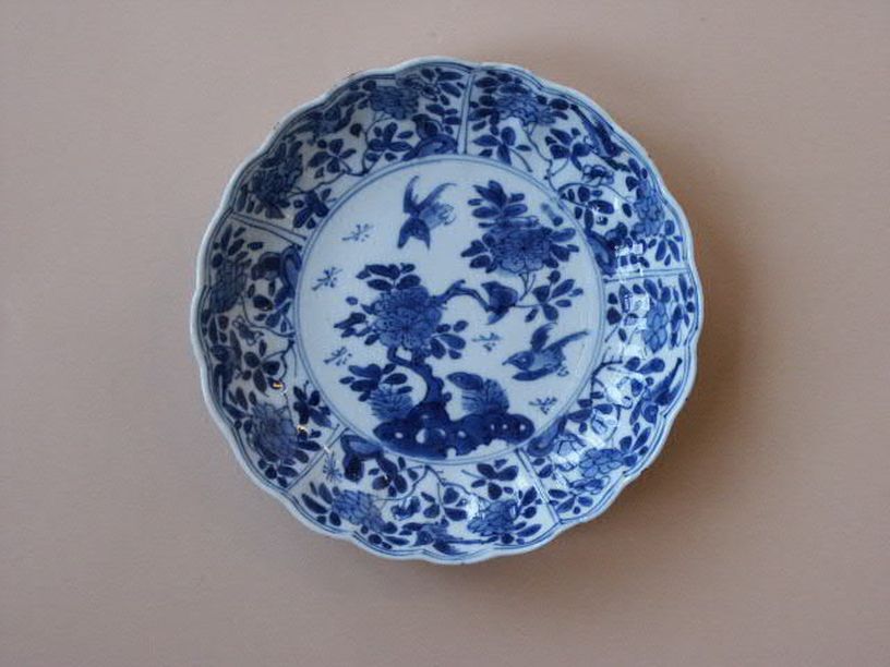 8 schoteltjes met gelobde wand en decor van bloeiende bomen en vogels
