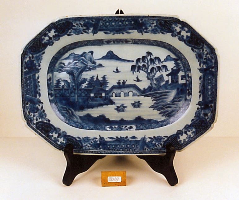 3 schalen, achthoekig, met decor van rivierlandschap