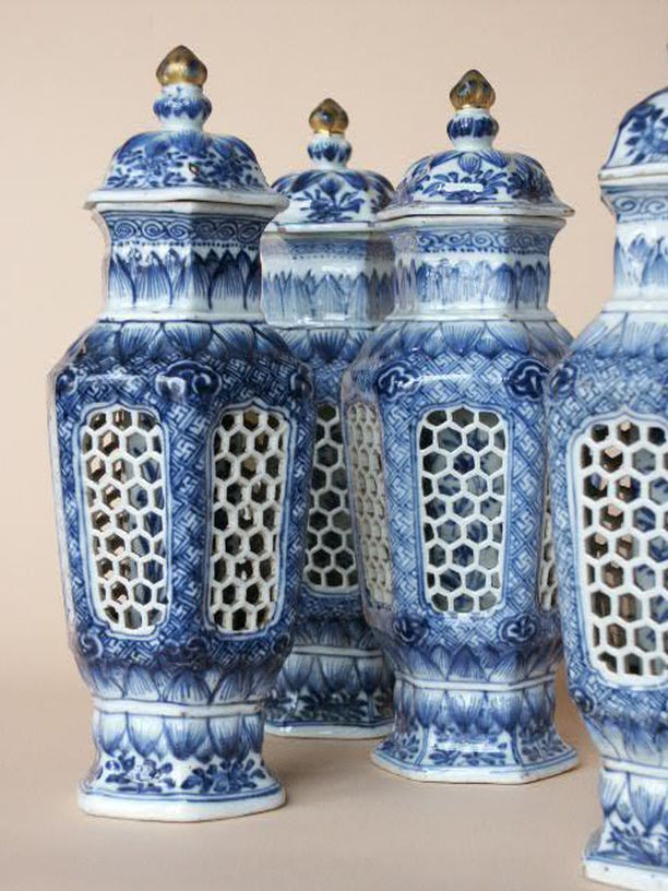 Set van vier vazen met deksel met blauwwit decor van bloemtakken en servetpatroon van swastika's