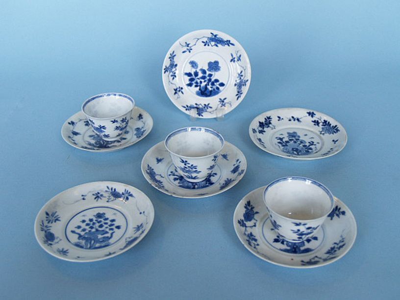 3 kopjes en 6 schotels met floraal decor in onderglazuur blauw