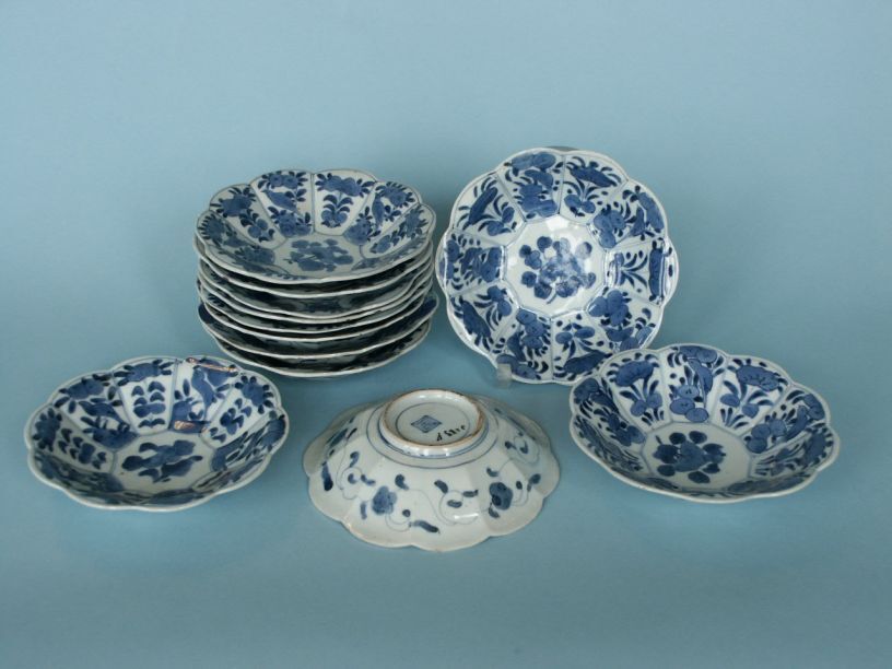 12 Schaaltjes met in het centrum decor van bloemtak en op de wand 10 velden met afwisselend een bloemtak en een vogel