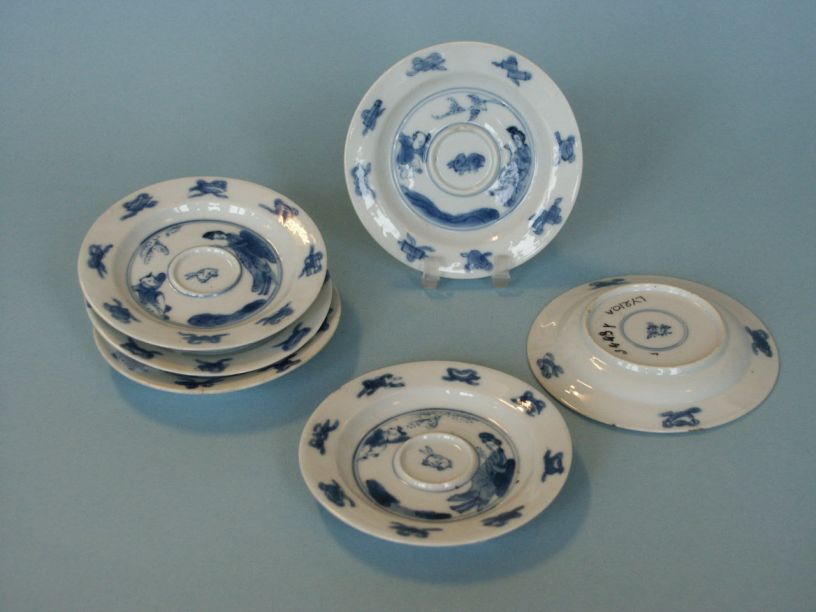 6 schoteltjes met decor van lange lijs en donsend zotje in onderglazuur blauw