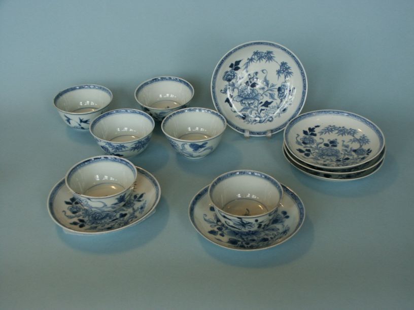 6 kop en schotels met decor van pioenrozen en bamboe, lingzi en ruyi-motieven