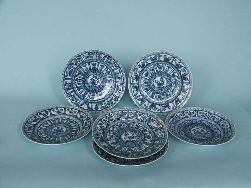 6 borden met decor van medaillon waarin een bloeiende plant omgeven door velden met bloemtakken