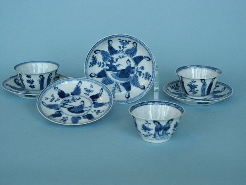 3 koppen en 4 schotels met decor van lange lijzen en bloesemtakken