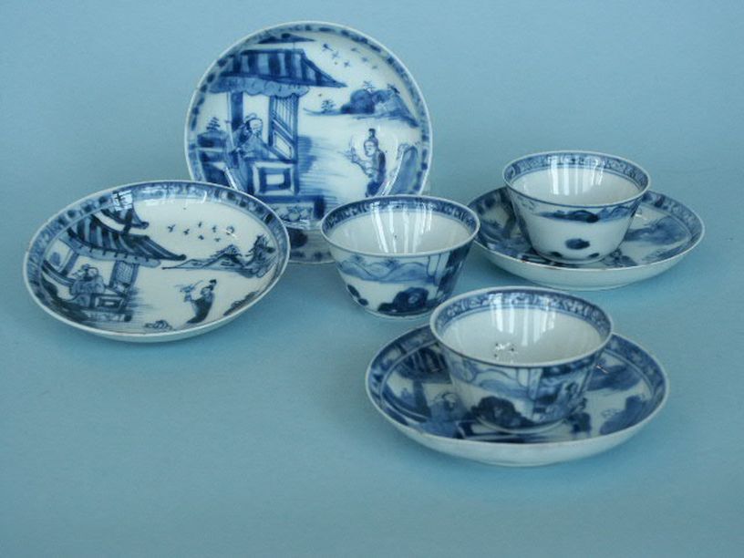 3 koppen en 6 schotels met decor van rivierlandschap waarin figuren en vogels