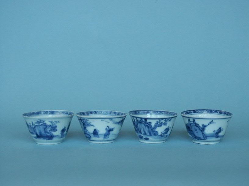 4 koppen met decor van landschap met huizen en figuren