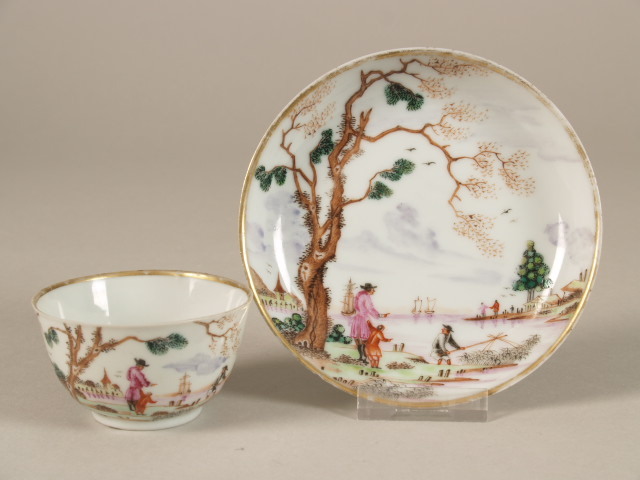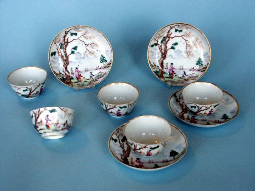 6 Koppen en 5 schotels met decor van Europees rivierlandschap met schepen en figuren, chine de commande, famille rose