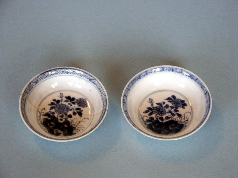 2 schoteltjes, diep, met decor van rots met bloemtakken en grassprieten