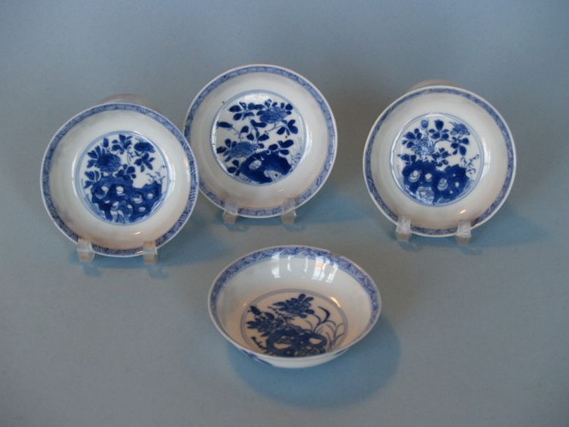 4 schoteltjes met centraal decor van rots met pioenrozen