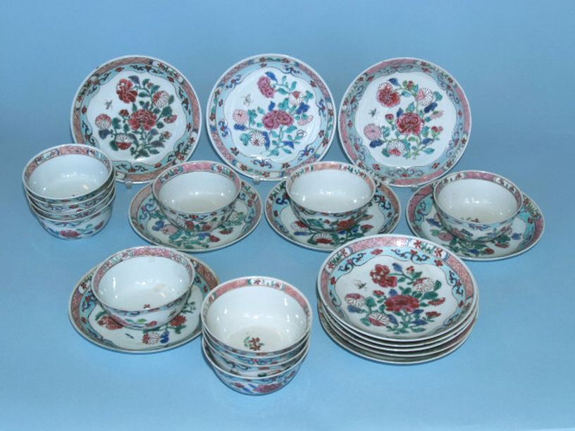 Twaalf paar kop en schotels met decor van pioenrozen, chrysanten en vlinder