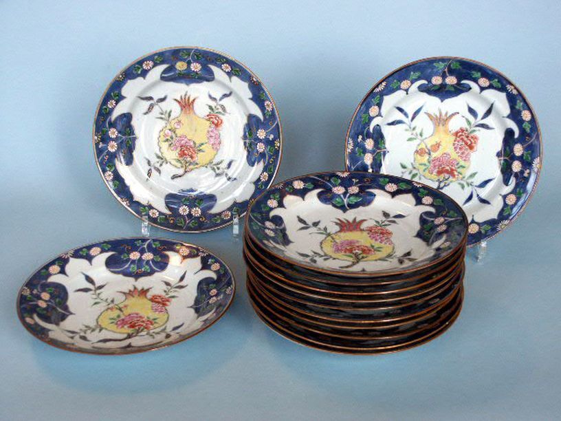 15 borden met decor medaillon met granaatappel met pioenroos, famille rose