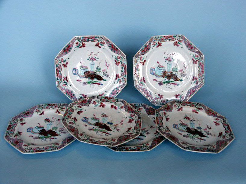 6 borden, achthoekig, met decor van palmblad met bloemvaas en symbolen, famille rose