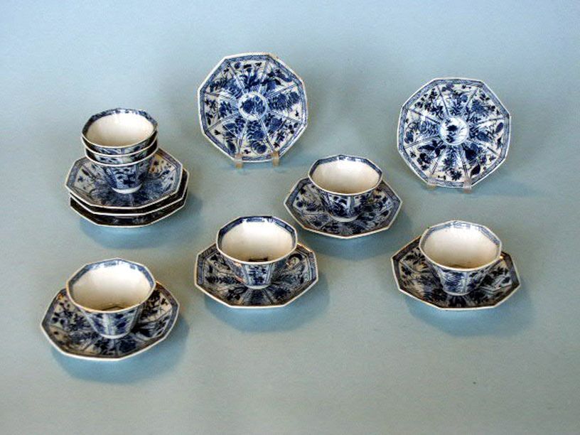 7 Koppen en 9 schotels met decor van 8 vakken met bloemranken