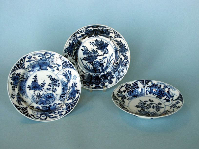 3 Borden met decor van bloemranken, rotsen en ruyi