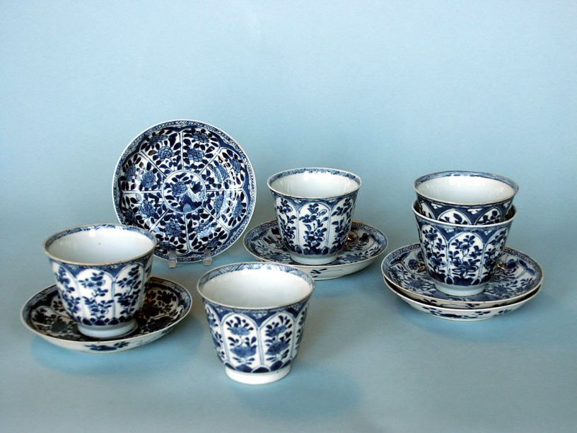 8 Koppen en 7 schotels met decor van bloemranken