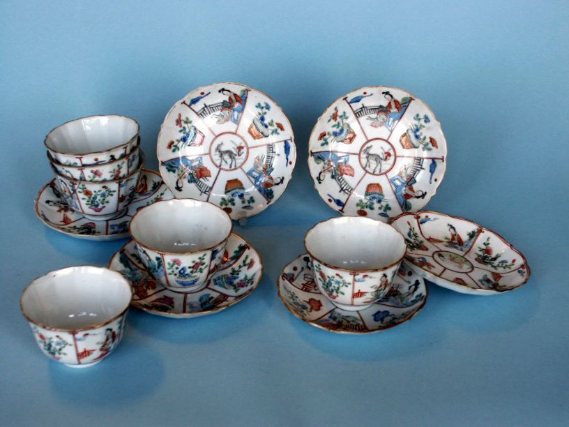 6 kop en schotels met decor van hert en lingzi, famille rose