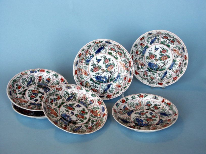 6 Borden met decor van rots en een prunustak, waterplanten, karper en insecten