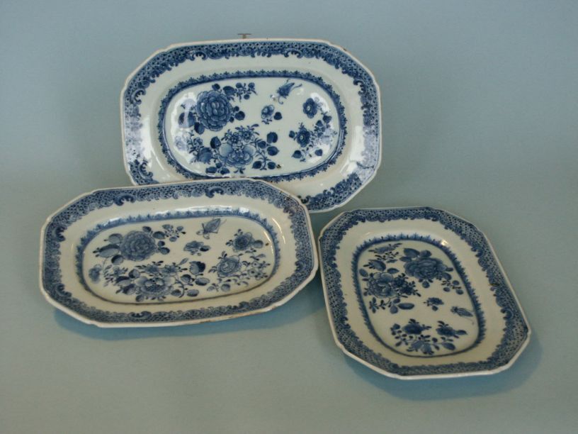 Drie Schalen met decor van bloemboeketten, pioenrozen en insecten